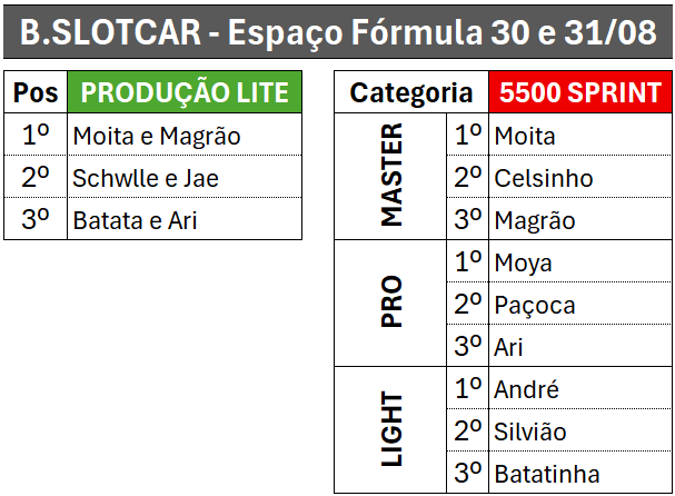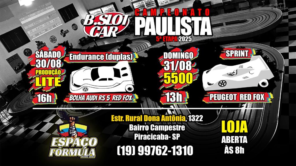 A B.SLOTCAR e o Espaço Fórmula convidam os amigos e pilotos para a 5ª Etapa do Campeonato Paulista 2025, que será realizada nos dias 30 e 31 de agosto.