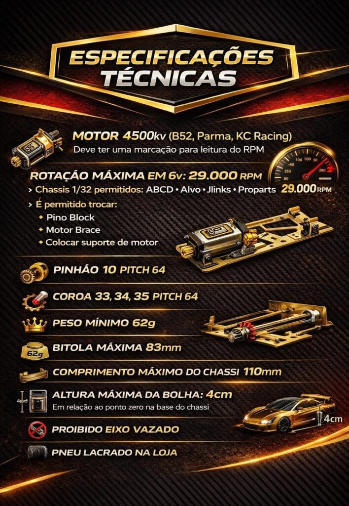 Chassis 1/32 – ABCD, Alvo, Jlinks e Proparts. É permitido trocar o pillow Block, motor brace ou colocar